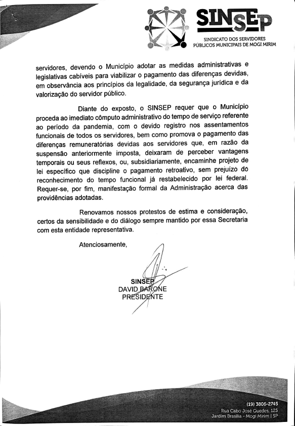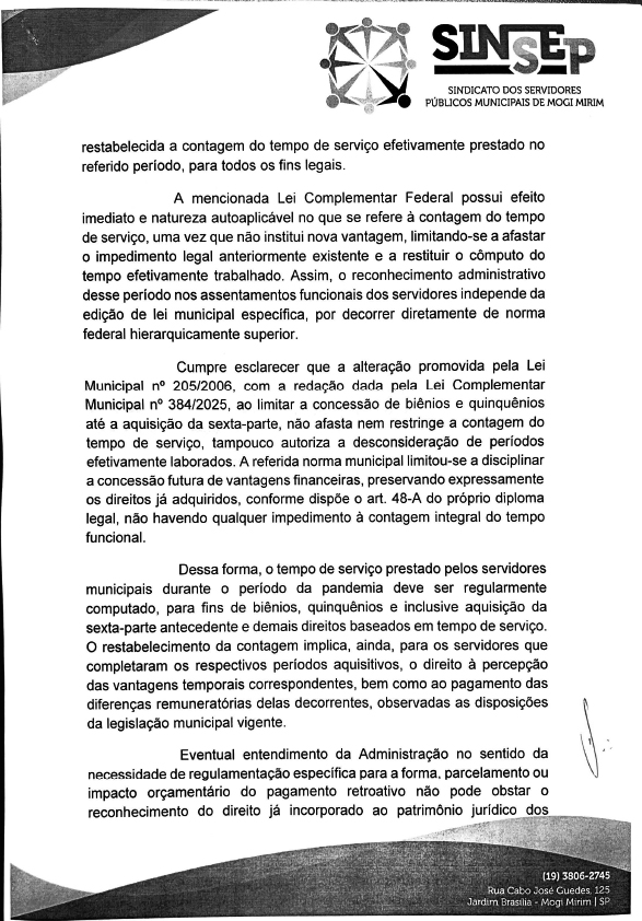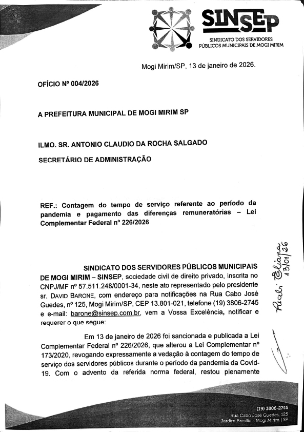 O SINSEP protocolou ofício na Prefeitura de Mogi Mirim cobrando a aplicação imediata da Lei Complementar Federal nº 226/2026, sancionada ontem, que garante a contagem do tempo de serviço dos servidores públicos durante o período da pandemia da Covid-19.