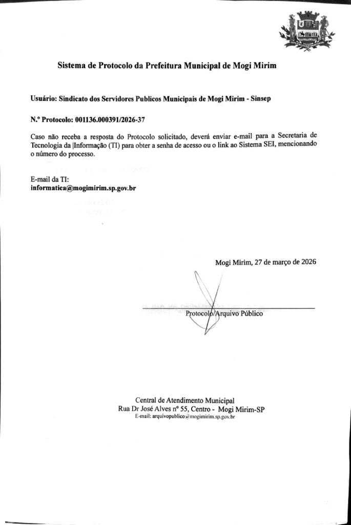 Foi informado aos participantes que a deliberação aprovada seria protocolada junto à Prefeitura no próximo dia útil imediato (veja imagem abaixo), bem como a juntada aos autos do TRT-15 e que os servidores seriam mantidos informados por meio dos canais oficiais de comunicação do SINSEP.
